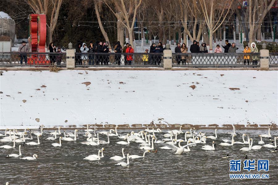 1月18日,在库尔勒市孔雀河畔,游客及市民在观看天鹅。