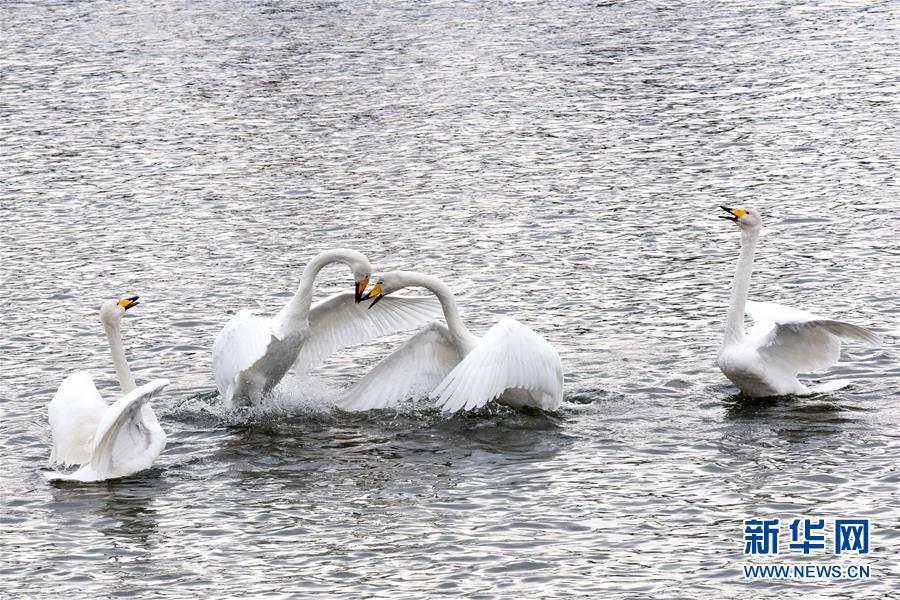 1月18日,天鹅在库尔勒市孔雀河嬉戏。