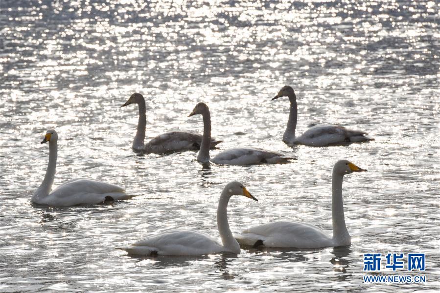 连日来,400余只天鹅在新疆库尔勒市孔雀河上栖息越冬,吸引众多市民和游客前来观赏。