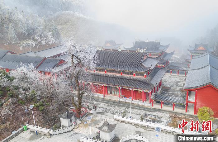 航拍云雾缭绕下的江西武宁太平山佑圣宫,红墙黑瓦,画面唯美。 翁第亮 摄
