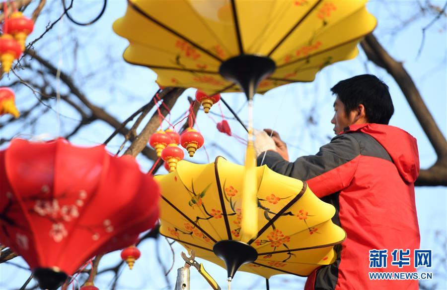 1月19日,工作人员在北京石景山游乐园安装伞形彩灯。 春节将至,北京石景山游乐园张灯结彩,装饰一新,并筹备多项主题游园活动喜迎佳节。 新华社记者 李俊东 摄
