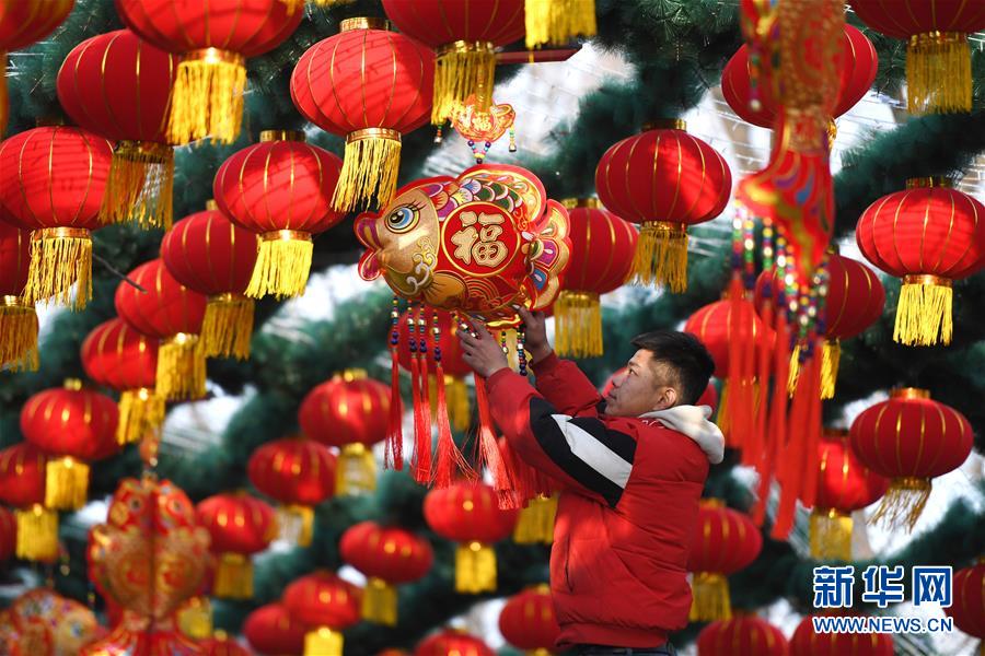 1月19日,工作人员在北京石景山游乐园彩灯长廊布置彩灯。 春节将至,北京石景山游乐园张灯结彩,装饰一新,并筹备多项主题游园活动喜迎佳节。 新华社记者 李俊东 摄