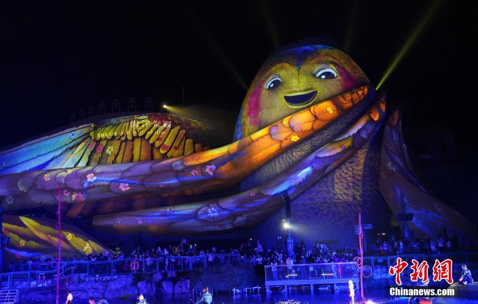 1月19日晚,香港海洋公园新近推出的全新多媒体特效汇演“光影盛夜”在海洋奇观和梦幻水都人工湖上演。“光影盛夜”汇演由园方与国际知名多媒体及娱乐工作室 Moment Factory 联袂推出,以光雕投影和原创音乐演绎人与自然的故事,配合火焰、激光、烟雾、水幕的特效,加上20位演员的现场舞蹈和杂耍表演,给人以全新的视听享受。图为投影在海洋奇观外墙上的精灵ANIMO化身雀鸟形象。中新社记者 张炜 摄