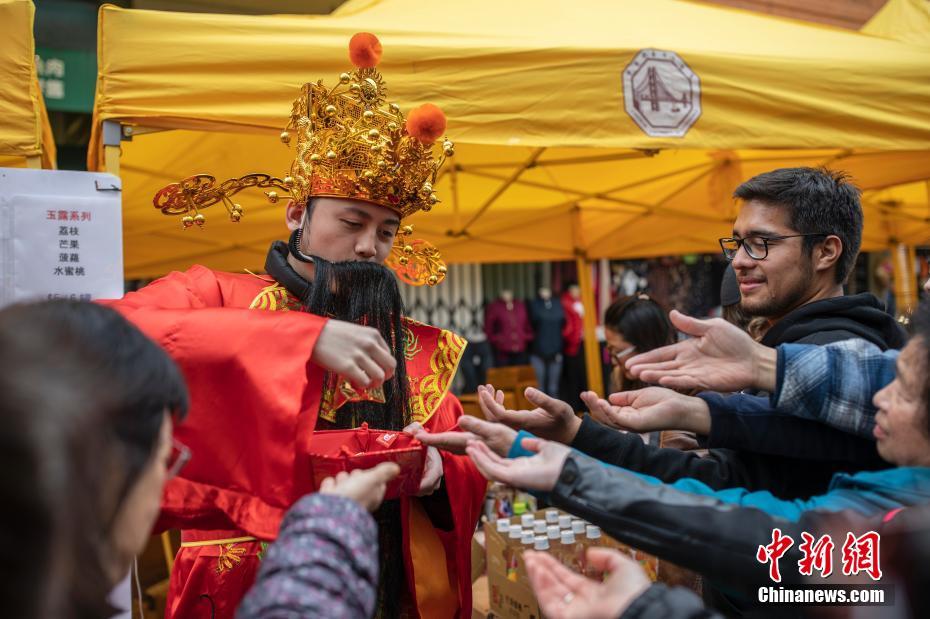 一位“财神”在旧金山“中国城”的春节花市上向市民散发礼品。中新社记者 刘关关 摄