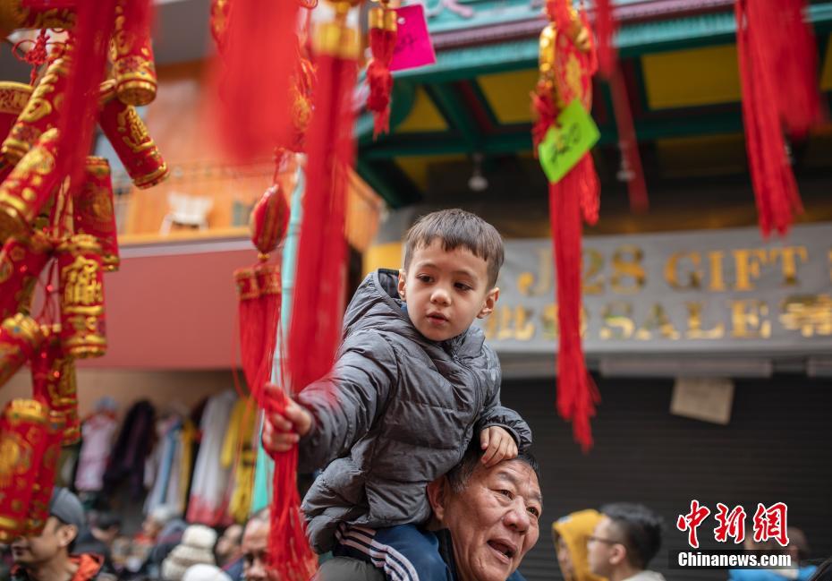 儿童被“中国城”春节花市上售卖的节日用品所吸引。中新社记者 刘关关 摄