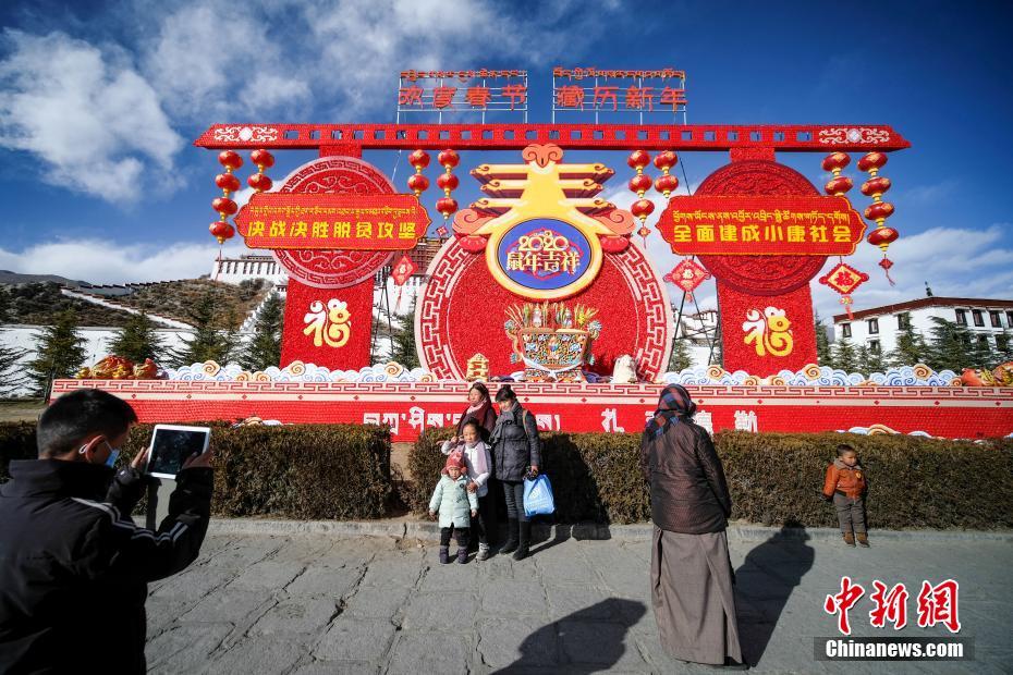 1月20日,随着春节和藏历新年的日益临近,拉萨布达拉宫前搭起了“欢度春节 藏历新年”大型装饰,古城拉萨大街小巷到处洋溢着浓浓的年味。图为当地民众在“欢度春节 藏历新年”大型装饰前合影留念。 中新社记者 何蓬磊 摄