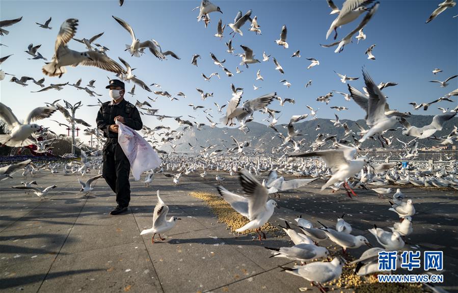 2月2日,昆明市滇池国家旅游度假区草海大坝综合管理办公室的工作人员在投放鸥粮。 新型冠状病毒感染的肺炎疫情防控工作启动以来,昆明市关闭了多个景区,其中包括翠湖公园、草海大坝等观鸥景点。为了保证红嘴鸥顺利过冬,昆明市林业和草原局等部门1月26日起组织工作人员每天两次在红嘴鸥主要的觅食点进行投喂,每天投喂的鸥粮有1000多公斤。 自1985年以来,红嘴鸥已连续30余年从遥远的西伯利亚等地飞往春城昆明越冬。据昆明市鸟类协会观察统计,这个冬天来昆明越冬的红嘴鸥有4万余只,数量创下历年之最。 新华社记者江文耀摄