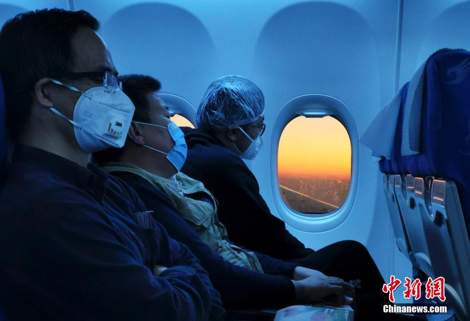 2月10日,在海南三亚飞往北京的航班上,乘客戴口罩和浴帽欣赏窗外的夕阳。中新社记者 杜洋 摄
