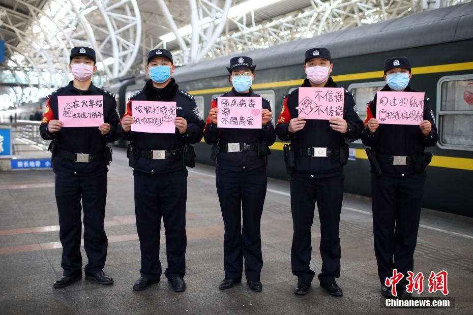 2月10日,南京铁路公安处南京站派出所民警在纸上写下“隔离病毒、不隔离爱”、“武汉加油、中国加油”、“您的平安出行是我们最大的心愿”“出站请测体温,安全你我他”等话语,并在他们不同的岗位上拍下照片,用别样的方式给旅客们送上温馨的提醒和祝福。中新社记者 泱波 摄
