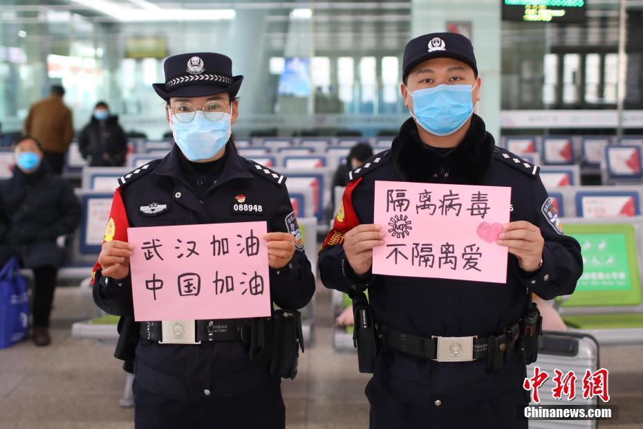2月10日,南京铁路公安处南京站派出所民警在纸上写下“隔离病毒、不隔离爱”、“武汉加油、中国加油”、“您的平安出行是我们最大的心愿”“出站请测体温,安全你我他”等话语,并在他们不同的岗位上拍下照片,用别样的方式给旅客们送上温馨的提醒和祝福。中新社记者 泱波 摄