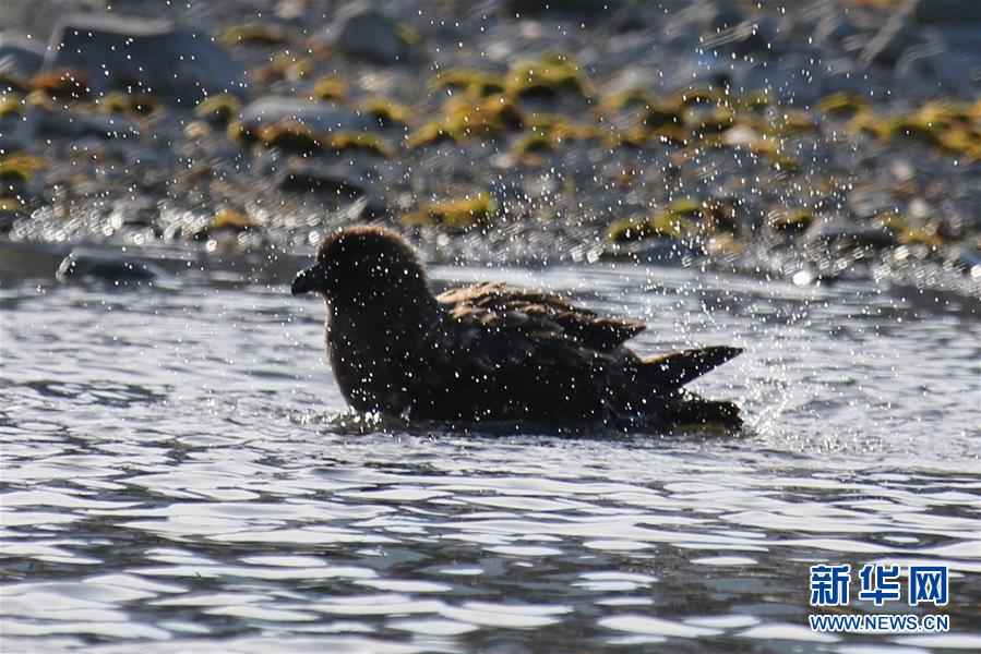 长城站贼鸥湖里戏水的贼鸥(2月10日摄)。