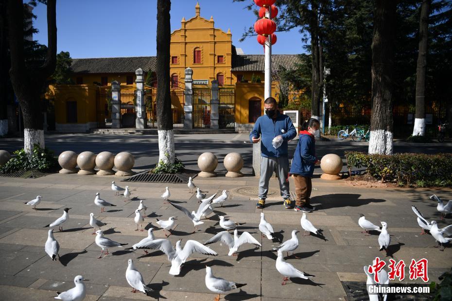 2月14日,昆明市民在给红嘴鸥喂食。新冠肺炎疫情发生以来,昆明市多个观鸥景点封闭,观鸥游客减少,除相关工作人员每天投喂红嘴鸥以外,仍有许多市民心系这群白色小精灵,他们每天都会来到红嘴鸥聚集的地方进行投喂。 中新社记者 刘冉阳 摄