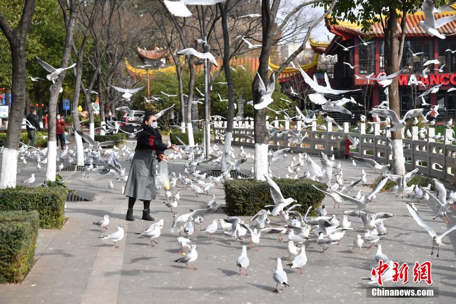 2月14日,昆明市民在给红嘴鸥喂食。新冠肺炎疫情发生以来,昆明市多个观鸥景点封闭,观鸥游客减少,除相关工作人员每天投喂红嘴鸥以外,仍有许多市民心系这群白色小精灵,他们每天都会来到红嘴鸥聚集的地方进行投喂。 中新社记者 刘冉阳 摄