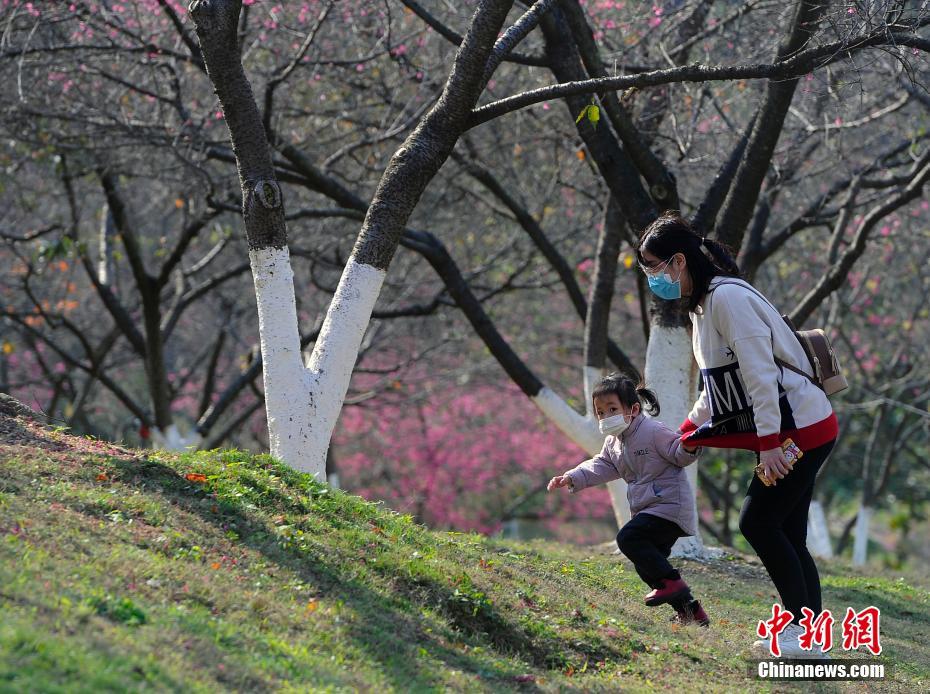一位儿童和家人带着口罩前来观赏樱花。