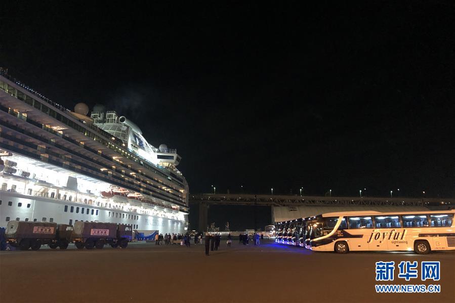 2月19日,在日本横滨,巴士停在“钻石公主”号邮轮附近准备转运部分中国乘客前往东京羽田机场。 “钻石公主”号邮轮上的乘客19日起开始分批下船。在中央政府的统筹下,经中国驻日本大使馆、外交部驻香港公署、香港特别行政区政府有关部门紧密协调,特区政府派包机撤离中国乘客前往香港。首架包机20日从东京羽田机场起飞。 新华社发(久富观光巴士公司供图)
