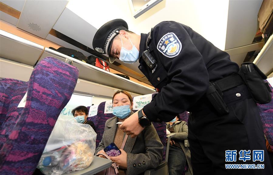 2月19日,在广西百色站开往广州南站的列车上,警务人员检查旅客证件。 近日,随着复工复产企业逐渐增多,广西百色火车站客流量有所增加。 新华社记者 陆波岸 摄