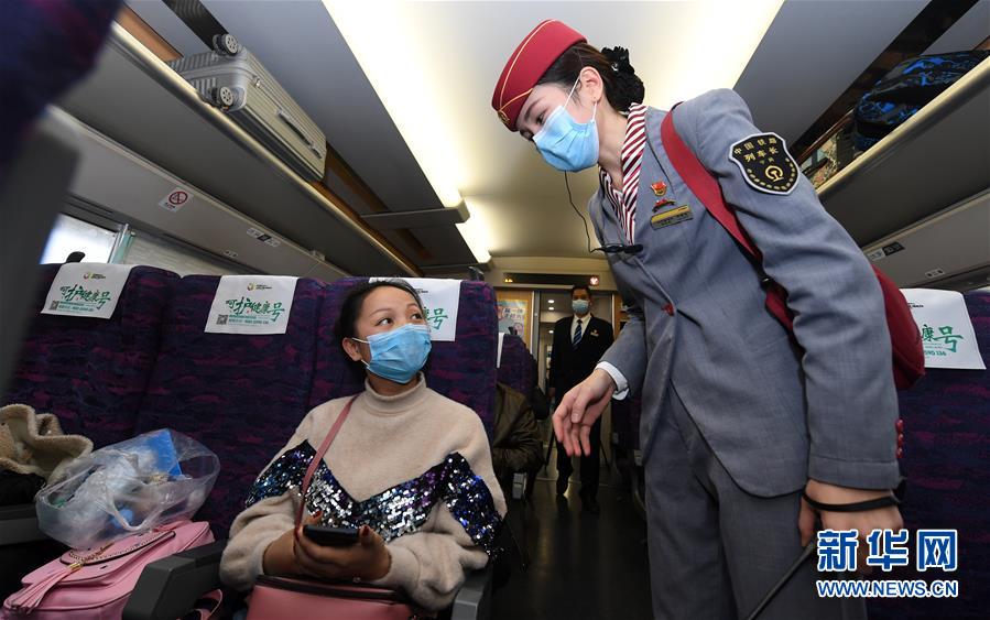 2月19日,在广西百色站开往广州南站的列车上,列车长询问旅客行程。 近日,随着复工复产企业逐渐增多,广西百色火车站客流量有所增加。 新华社记者 陆波岸 摄
