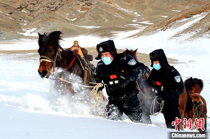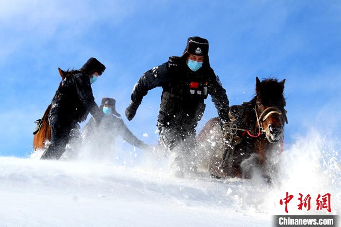 民警牵马在雪中费力前行。 孟伟健 摄
