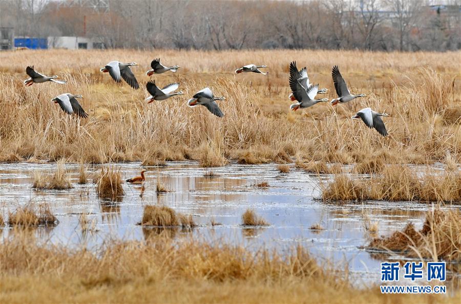 斑头雁在拉鲁湿地上空飞翔(2月24日摄)。 初春的拉萨,气温回升,拉鲁湿地国家级自然保护区冰雪消融、百鸟飞舞。位于拉萨市西北的拉鲁湿地国家级自然保护区海拔3645米,湿地保护面积近13平方公里,被誉为“拉萨之肺”。 新华社记者 张汝锋 摄