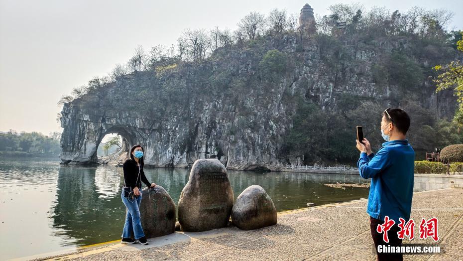2月26日,广西桂林市象山景区正式对外恢复开放。这是广西桂林市21日宣布该市82个A级旅游景区向国内外疫情防控低风险地区游客有序开放的首个景区。图为来自广东的游客在象鼻山前拍照留念。 中新社记者 欧惠兰 摄