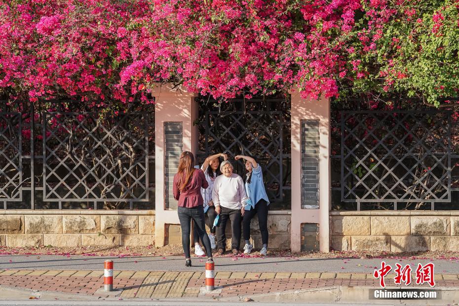 2月27日,广西南宁市青环路路旁的三角梅盛开,不少市民趁着晴好天气前来赏花拍照。中新社记者 陈冠言 摄