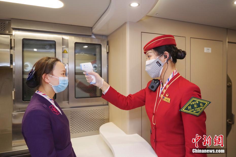 2月28日晚,在威海开往北京南的G470次列车上,列车长给餐车服务员测量体温。受新冠肺炎疫情影响,中国铁路北京局集团有限公司北京客运段担当值乘的高铁列车,对进京旅客全面测量体温,乘务人员值乘必须佩戴口罩,值乘中一天测量四次体温,对门把手、座椅扶手等重点部位每小时消毒一次。中新社记者 贾天勇 摄