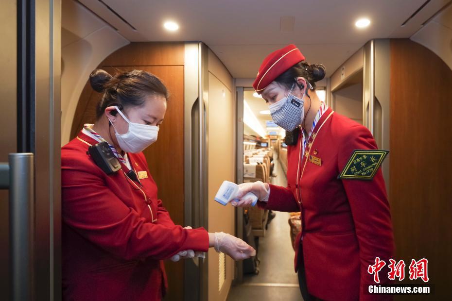 2月28日晚,在威海开往北京南的G470次列车上,列车长给乘务员测量体温。受新冠肺炎疫情影响,中国铁路北京局集团有限公司北京客运段担当值乘的高铁列车,对进京旅客全面测量体温,乘务人员值乘必须佩戴口罩,值乘中一天测量四次体温,对门把手、座椅扶手等重点部位每小时消毒一次。中新社记者 贾天勇 摄