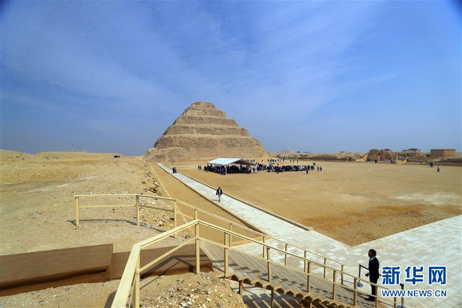 这是3月5日在埃及吉萨省塞加拉地区拍摄的修复完成后的阶梯金字塔。 埃及旅游和文物部5日宣布,位于首都开罗以南约30公里的塞加拉地区的阶梯金字塔修复完成。 新华社发(艾哈迈德·戈马 摄)