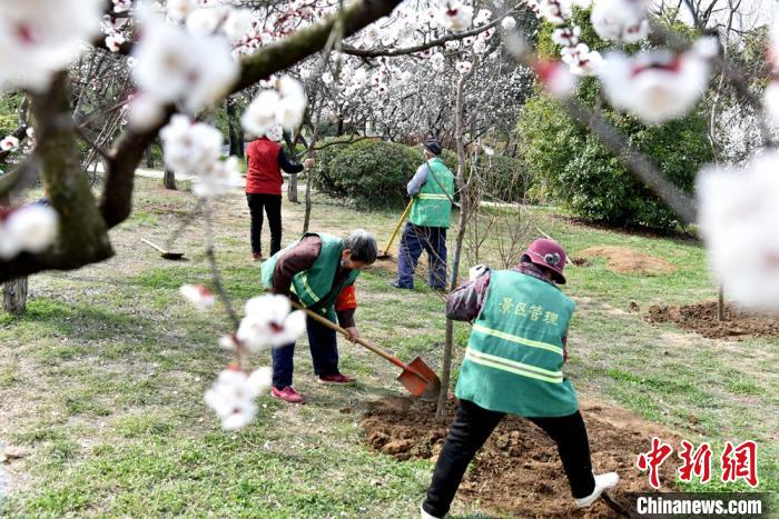 恰逢植树节,园林工作者种下200棵杏树。 朱志庚 摄