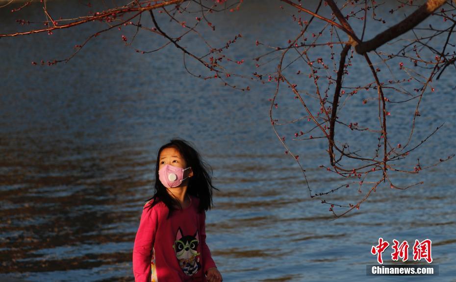 一名女孩观赏含苞待放的桃花。中新社记者 杜洋 摄