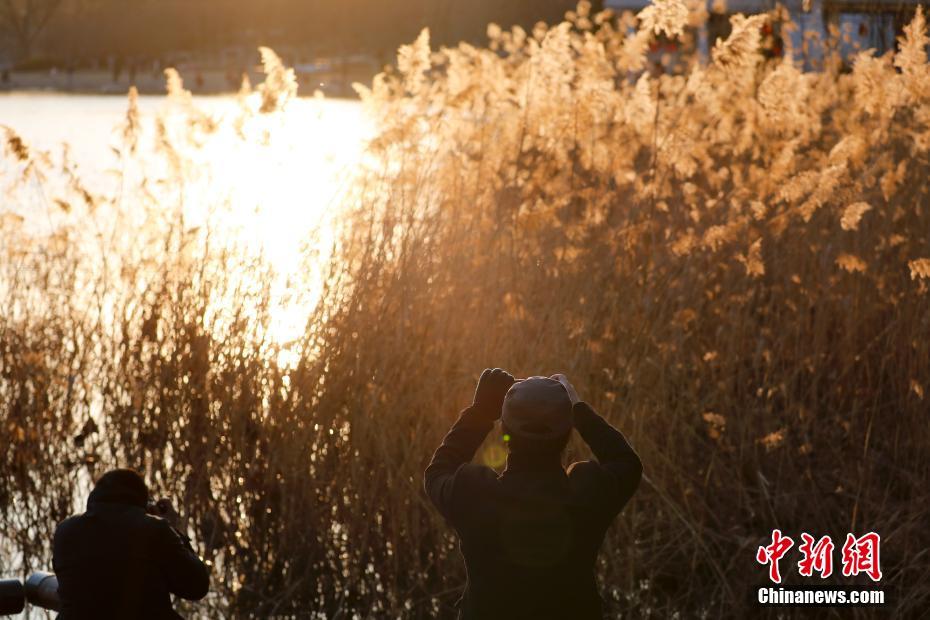 游客在北京玉渊潭公园拍摄芦苇和夕阳。中新社记者 杜洋 摄