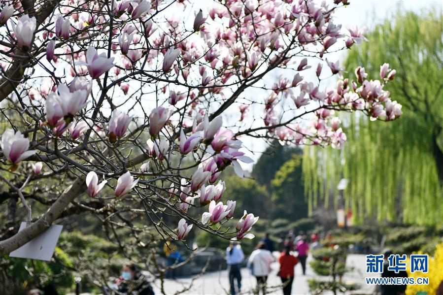 3月18日,游人在济南百花公园游玩。 近日,随着气温升高,山东济南百花公园内繁花似锦,春意盎然。 新华社记者 朱峥 摄