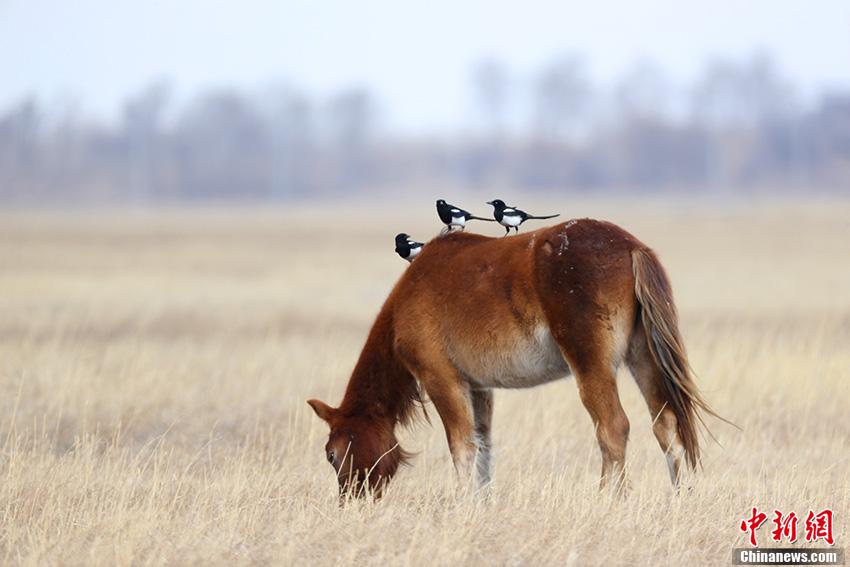 3月22日,吉林省镇赉县境内莫莫格湿地发现了约320只白鹤。这是今年春季白鹤首次回迁莫莫格湿地。镇赉县是东亚候鸟迁徙通道上的重要停歇地,世界极危物种白鹤东部种群(繁殖于西伯利亚东北部,在中国鄱阳湖越冬)每年春秋两季经此迁徙。图为喜鹊站在马背上,和谐的瞬间令人称奇。 潘晟昱 摄