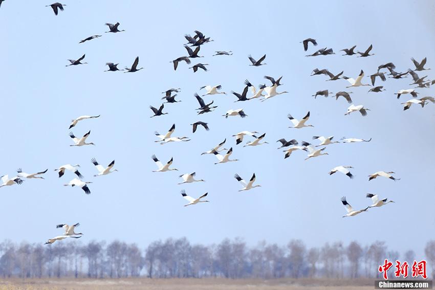 3月22日,吉林省镇赉县境内莫莫格湿地发现了约320只白鹤。这是今年春季白鹤首次回迁莫莫格湿地。白鹤、白头鹤初春季节来到莫莫格湿地,它们要在这里停留40余天,为接下来的迁徙旅程补充能量。 潘晟昱 摄