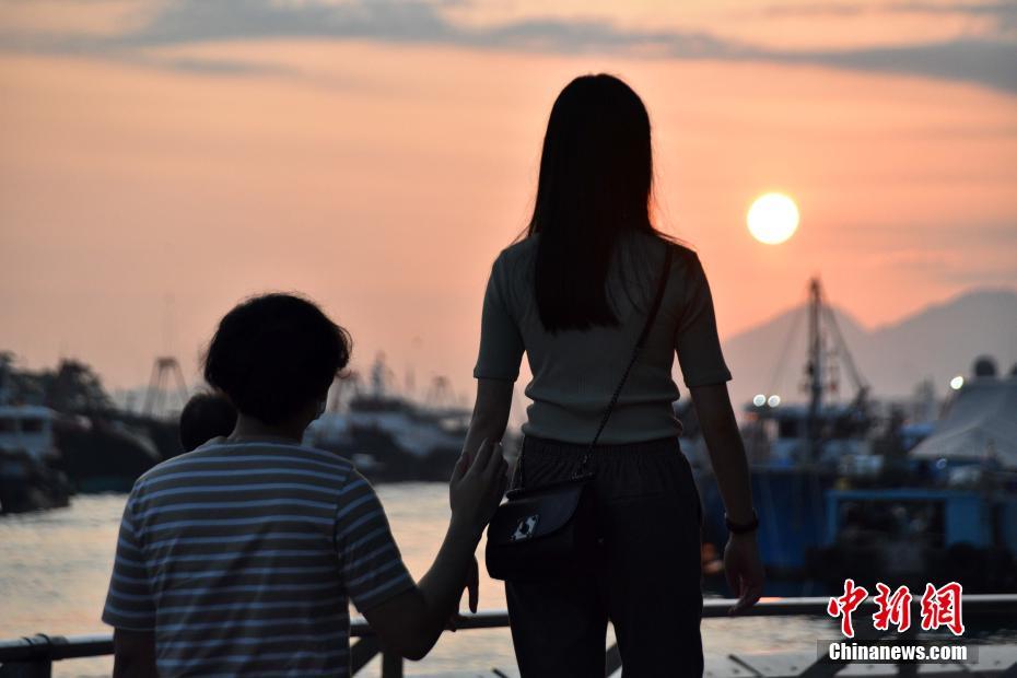 3月23日,一对情侣在香港仔海滨欣赏日落美景。从香港黄竹坑沿着海滨往香港仔方向,内海的避风塘黄昏景色宜人,时常吸引不少市民到此观赏。中新社记者 洪帆 摄