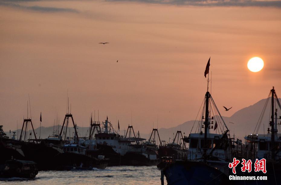 3月23日,香港仔避风塘停泊的渔船和日落相辉映。从香港黄竹坑沿着海滨往香港仔方向,内海的避风塘黄昏景色宜人,时常吸引不少市民到此观赏。中新社记者 洪帆 摄