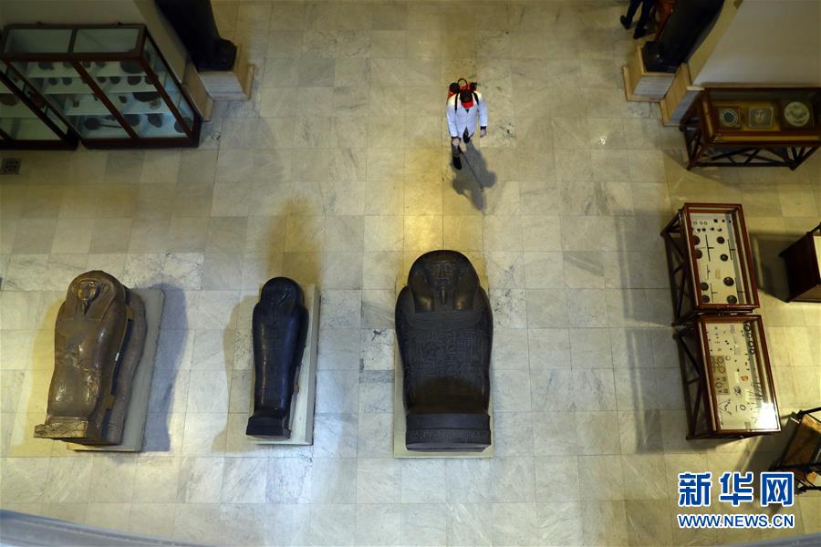 3月23日,一名男子在位于埃及首都开罗市中心的埃及博物馆内进行消毒。