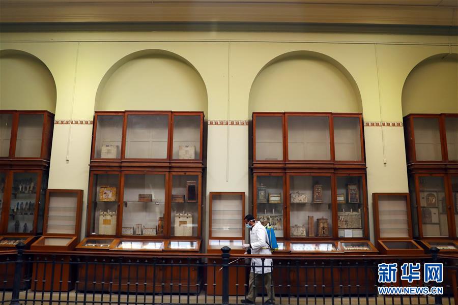 3月23日,一名男子在位于埃及首都开罗市中心的埃及博物馆内进行消毒。 新华社发(艾哈迈德·戈马摄)