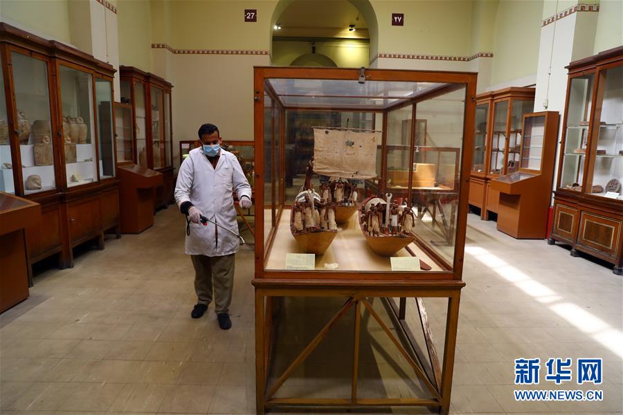 3月23日,一名男子在位于埃及首都开罗市中心的埃及博物馆内进行消毒。新华社发(艾哈迈德·戈马摄)