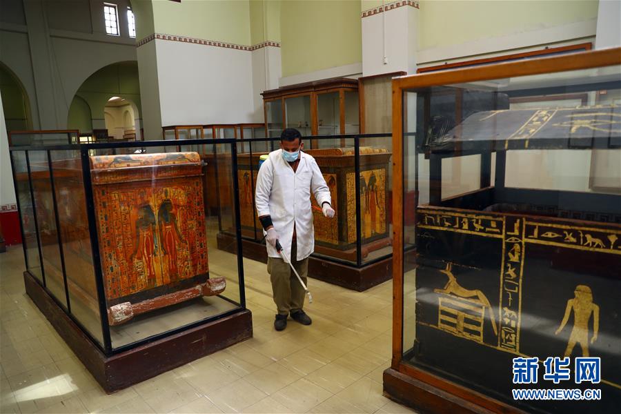 3月23日,一名男子在位于埃及首都开罗市中心的埃及博物馆内进行消毒。新华社发(艾哈迈德·戈马摄)