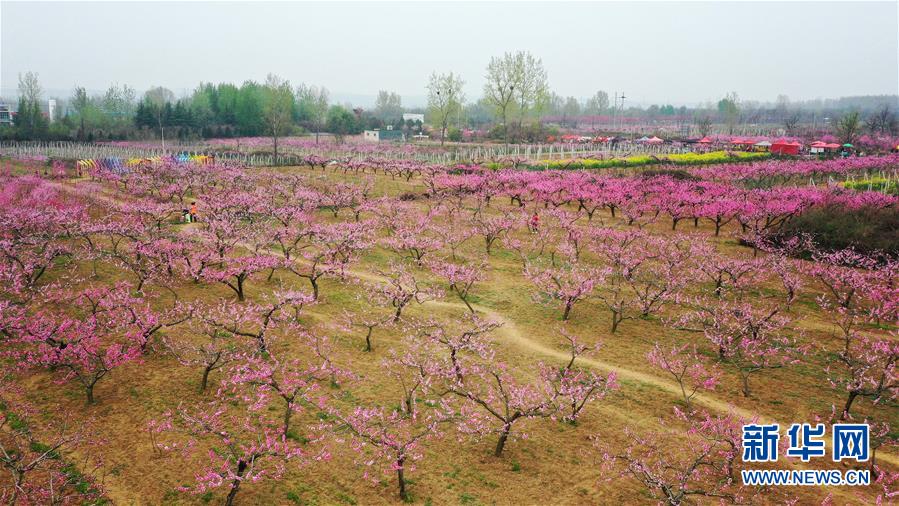 西安市长安区王莽街道的桃园(3月24日摄,无人机照片)。 近日,位于秦岭北麓的陕西西安长安区王莽街道万亩桃园内桃花绽放,吸引游人前来观光。 新华社记者 刘潇 摄