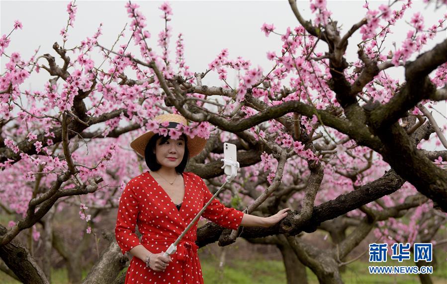 游人在西安市长安区王莽街道的桃园内自拍(3月24日摄)。 近日,位于秦岭北麓的陕西西安长安区王莽街道万亩桃园内桃花绽放,吸引游人前来观光。 新华社记者 刘潇 摄