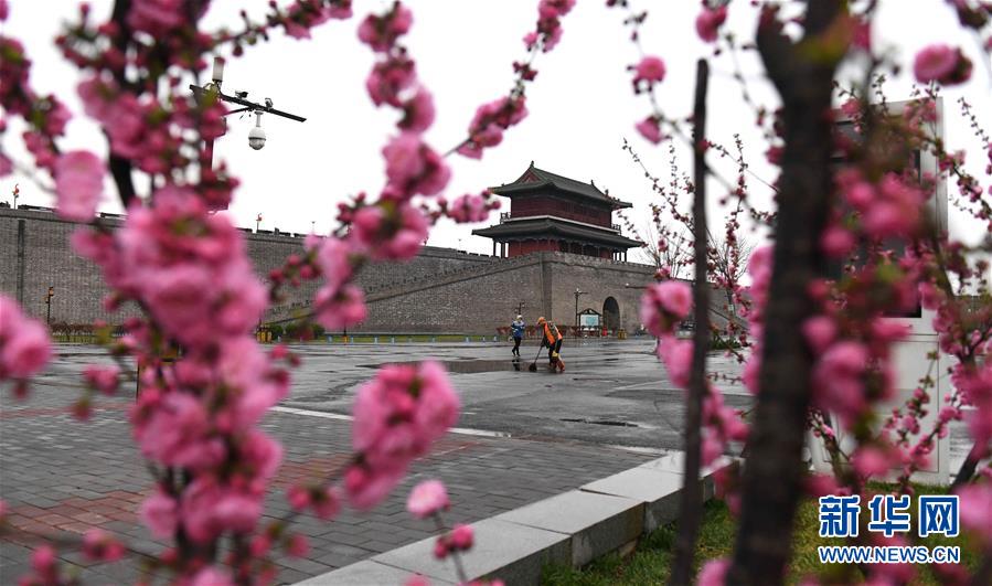 3月24日拍摄的雨后河北正定古城南城门景色。 连日来,河北省正定县在做好疫情防控工作的同时,有序分时开放正定县南城门、隆兴寺、荣国府等9个景区。景区采取定时消杀,扫码登记、体温检测、网络购票等形式,保障游客安全游览。 新华社发(陈其保 摄)