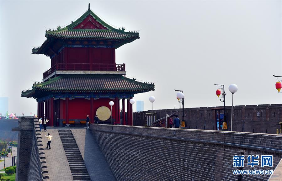 3月24日,游客在河北正定古城南城门上参观古城风貌。 连日来,河北省正定县在做好疫情防控工作的同时,有序分时开放正定县南城门、隆兴寺、荣国府等9个景区。景区采取定时消杀,扫码登记、体温检测、网络购票等形式,保障游客安全游览。 新华社发(张晓峰 摄)