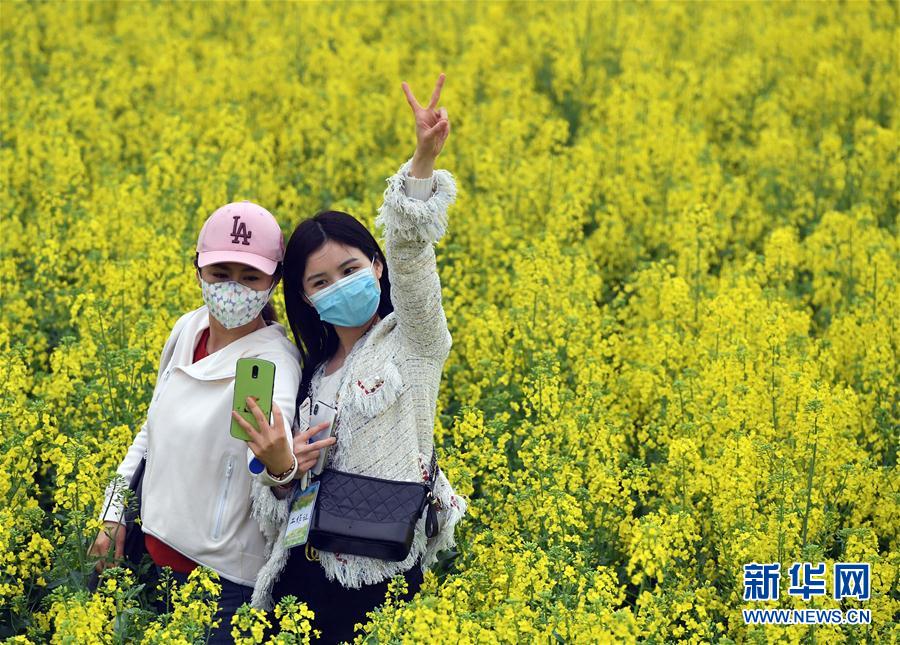 3月26日,游客在宝丰县龙王沟乡村振兴示范区的油菜花田中自拍。新华社记者 李嘉南 摄