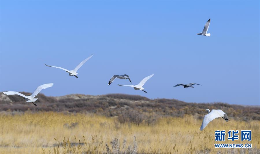 3月28日,水鸟在乌伦古湖国家级湿地公园内飞翔。 入春以来,大批候鸟来到新疆阿勒泰地区福海县乌伦古湖国家级湿地公园栖息,给这里增添了勃勃生机。近年来,福海县着力打造“春观水鸟夏戏水,秋赏风景冬捕鱼”的旅游品牌,乌伦古湖生态环境不断改善。 新华社记者 赵戈 摄