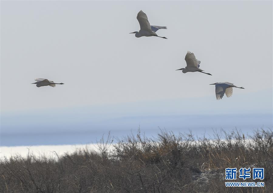 3月28日,水鸟在乌伦古湖国家级湿地公园内飞翔。 入春以来,大批候鸟来到新疆阿勒泰地区福海县乌伦古湖国家级湿地公园栖息,给这里增添了勃勃生机。近年来,福海县着力打造“春观水鸟夏戏水,秋赏风景冬捕鱼”的旅游品牌,乌伦古湖生态环境不断改善。 新华社记者 赵戈 摄