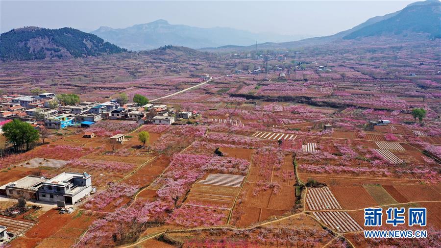 这是3月30日拍摄的济南市仲宫街道的桃花(无人机照片)。 随着气温升高,位于山东省济南市仲宫街道的万亩桃园进入盛花期,漫山遍野的桃花将大地装扮得美不胜收。 新华社记者 朱峥 摄