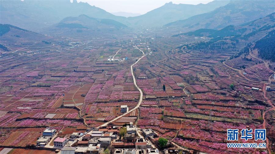 这是3月30日拍摄的济南市仲宫街道的桃花(无人机照片)。 随着气温升高,位于山东省济南市仲宫街道的万亩桃园进入盛花期,漫山遍野的桃花将大地装扮得美不胜收。 新华社记者 朱峥 摄