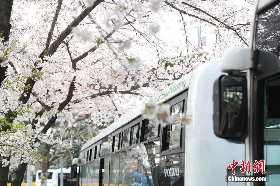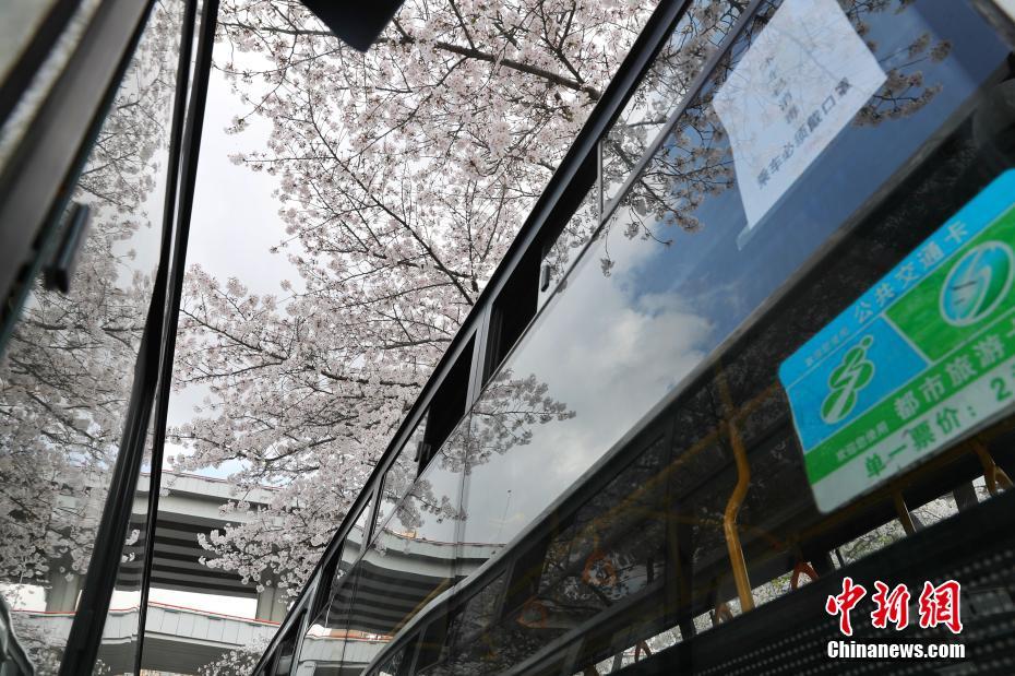3月31日,位于上海南浦大桥下的“樱花车站”迎来烂漫季节,公交车与樱花相映成趣。中新社记者 张亨伟 摄